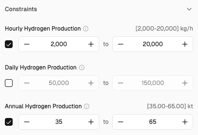 Define your technical, commercial, and financial constraints. Entropics searches thousands of configurations to find the ones that hit your targets.